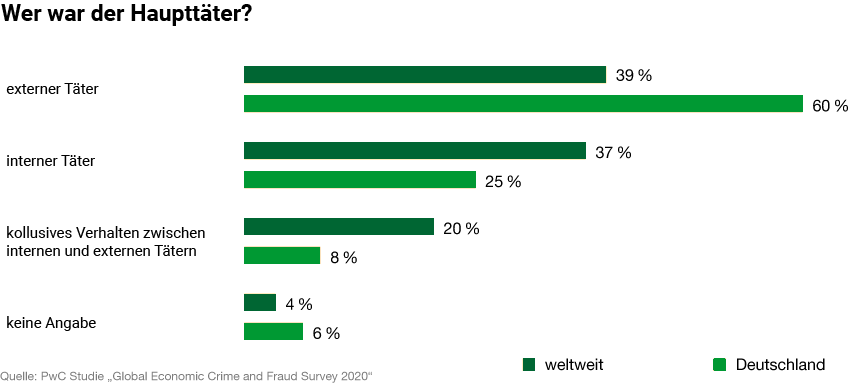 Bei rund 40 Prozent der Delikte kamen die Täter von außen. Etwas weniger, 37 Prozent, gehen auf das Konto von Mitarbeitern. In den restlichen Fällen agierten interne und externe Personen gemeinsam. Die externen Täter stammten überwiegend aus dem Kreis der Kunden oder Zulieferer des Unternehmens bzw. handelte es sich um Angriffe von Hackern.